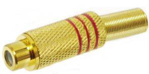 Descrizione: Presa coassiale RCA dorata con molla guidacavo. Isolamento in bachelite. Anelli rossi