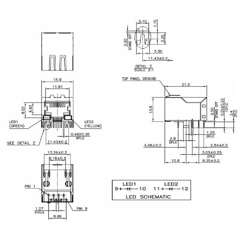 PRESA MODULARE RJ45 8P/8C CAT5 SCHERMATA DA PCB CON 2 LED VERDE GIALLO