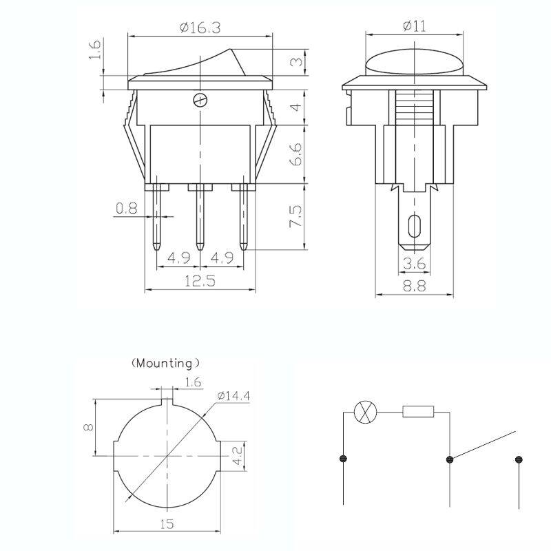 Dimensioni: Diametro ghiera frontale 16,3mm Diametro interruttore 11mm