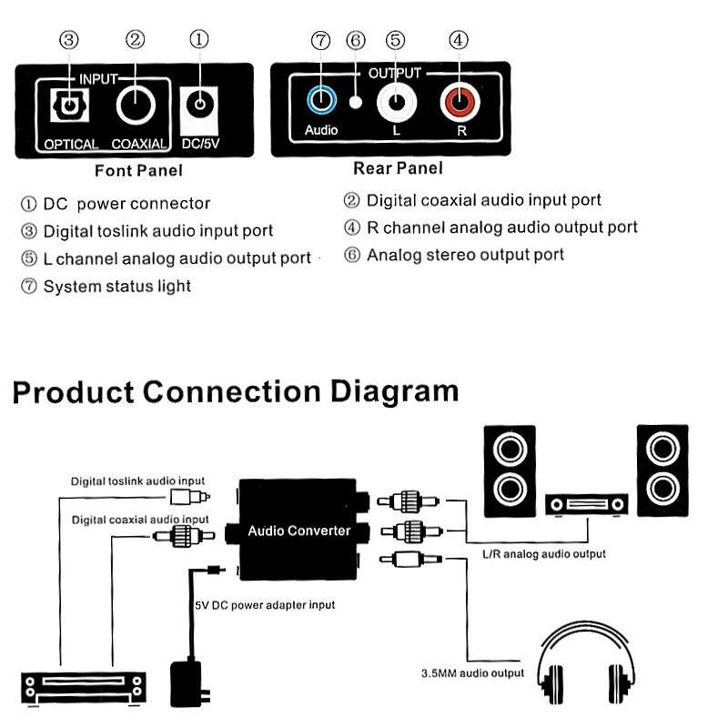 Descrizione: Convertitori attivo di segnale, converte un segnale audio stereo coassiale o toslink IN FIBRA OTTICA SPDIF in un segnale stereo analogico 2 RCA L/R