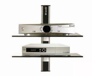 Descrizione: BRAVO CRYSTAL 2. Supporto a muro in alluminio anodizzato dotato di 2 piani in cristallo temperato per posizionare due apparecchi tra VCR, SAT, DVD o DTT.