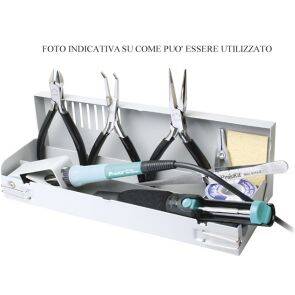 - Supporto per saldatore e porta eccessori .Nella scatola si possono inserire, oltre al saldatore, altri attrezzi per la saldatura stagno, pinzette, tronchesine, ecc..