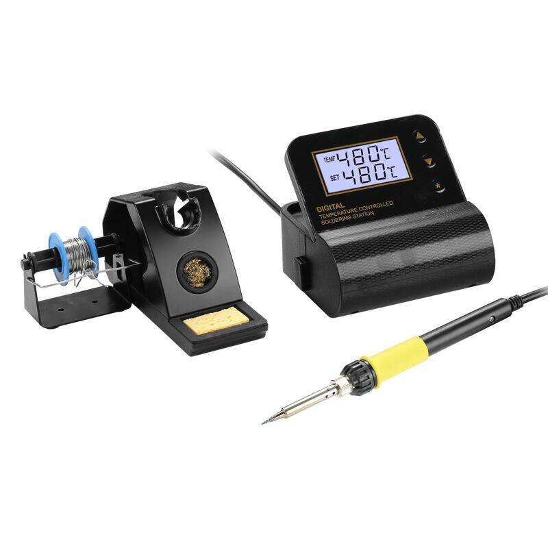 Grazie al saldatore controllato da microprocessore è possibile raggiungere rapidamente la temperatura desiderata e lavorare in modo efficiente. Il supporto per saldatore non è solo un posto sicuro per il ferro, ma è dotato anche di una spugna per la pulizia integrata e di una lana per pulire per mantenere la punta pulita e garantire risultati di saldatura ottimali. Inoltre la stazione dispone di un pratico dispenser per saldatura.
