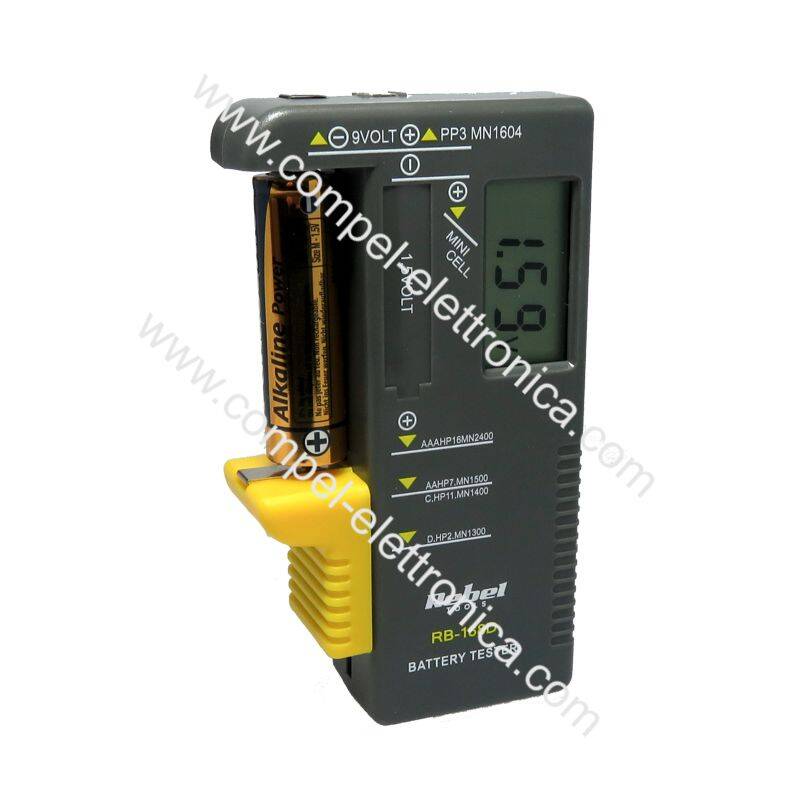 Descrizione: Tester per batterie con display utile per verificare lo stato di carica delle batterie stilo AA ministilo AAA mezza torcia C 9V torcia D