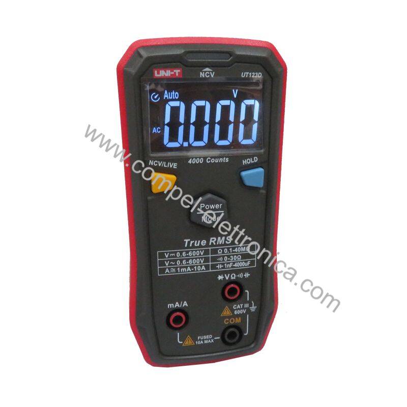 Una nuova innovazione di UNI-T del multimetro RMS UT123D. Può identificare e misurare automaticamente la tensione CA/CC, la corrente CA/CC, la resistenza e la capacità con la semplice pressione di un solo pulsante. Il design compatto e il display EBTN con 4000 conteggi lo rendono un ottimo strumento per la casa, il fai da te e al lavoro in ambienti bui. La funzione di conservazione dei dati evita di dover effettuare misurazioni doppie non necessarie e la funzione di spegnimento automatico consente di risparmiare sull'utilizzo della batteria. Per varie funzioni di misurazione, il multimetro digitale intelligente fornisce segnali acustici e visivi aggiuntivi tramite il cicalino e l'indicatore LED colorato.