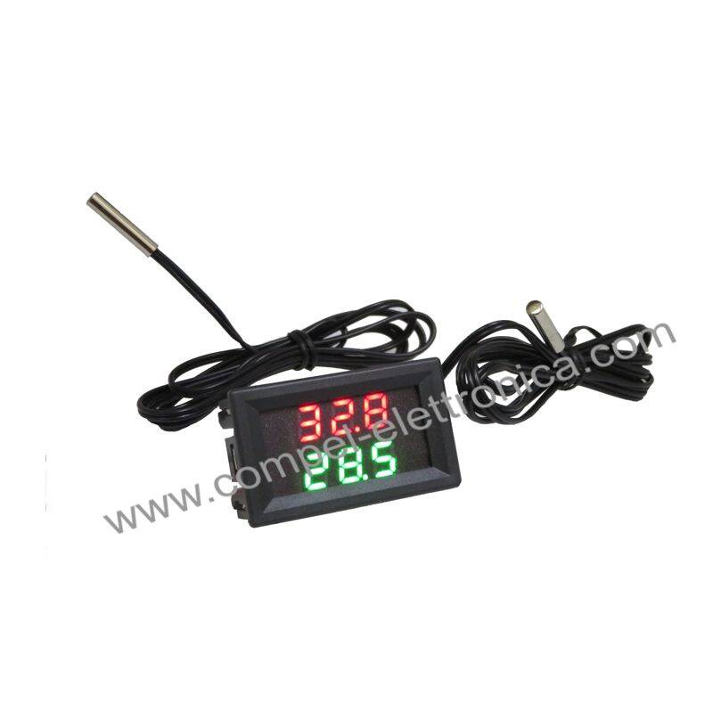 Termometro da pannello con doppio display VERDE ROSSO e doppia sonda, adatto per misurazioni interno e esterno.