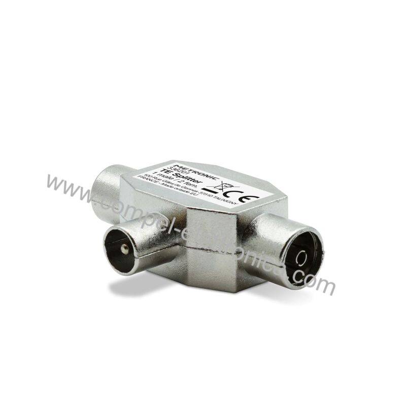 Descrizione: Partitore o sdoppiatore induttivo TV coassiali da spina a doppia presa 75 ohm