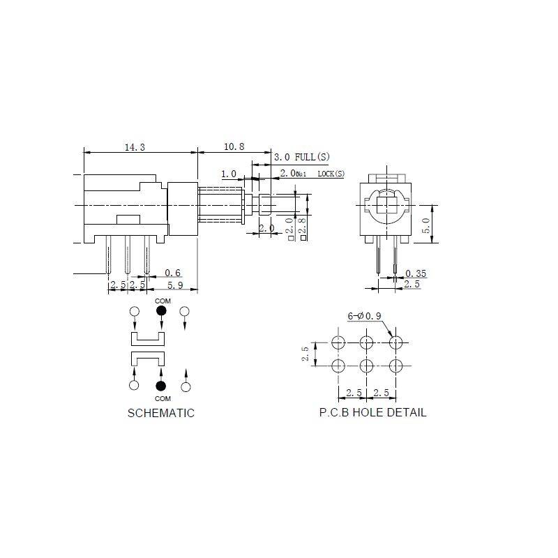 Descrizione: Microdeviatore bipolare a pulsante due scambi 90°C a circuito stampato