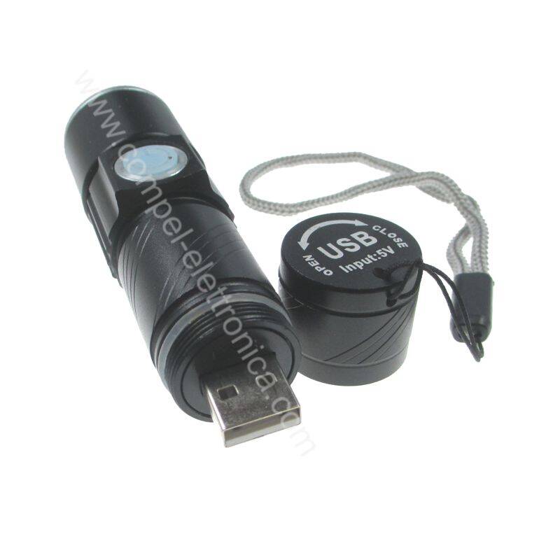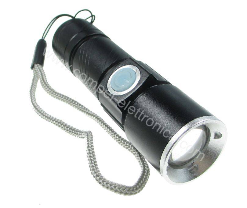 TORCIA A LED 5W 2000Lm RICARICABILE CON SPINA USB, ZOOM, STROBE, STAGNA