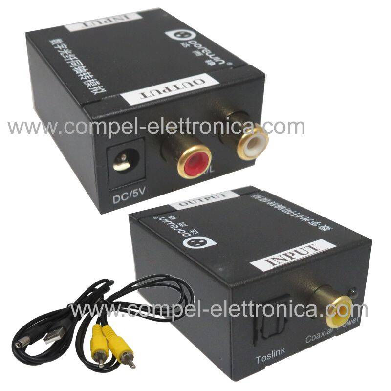Descrizione: Convertitori attivo di segnale, converte un segnale audio stereo coassiale o toslink IN FIBRA OTTICA SPDIF in un segnale stereo analogico 2 RCA L/R